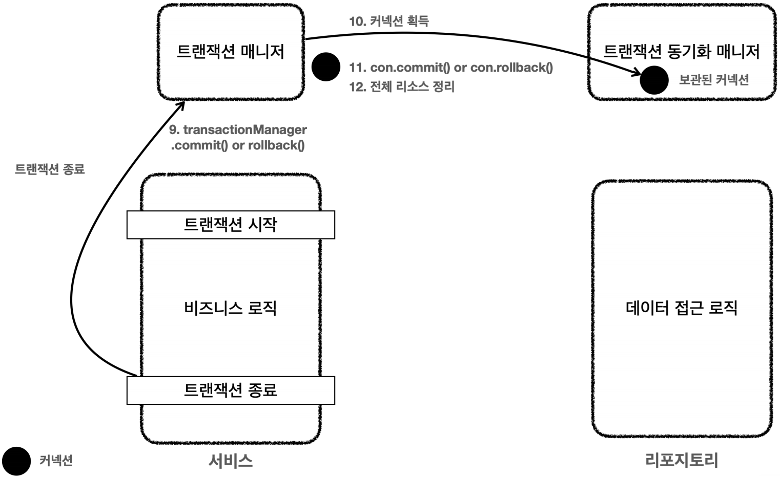 commit()이나rollback()메소드 호출 - 트랜잭션 매니저가 트랜잭션 동기화 매니저에서 보관된 커넥션을 획득 후 커밋이나 롤백 진행
